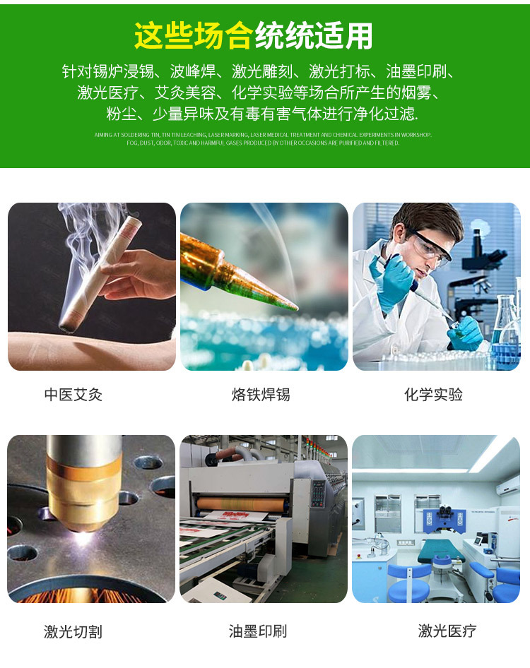 制藥,汽車,輕工,選礦,電鍍,冶金,烙鐵焊接,粉塵粉末,煙塵,激光打標,錫爐、波峰焊、回流爐等